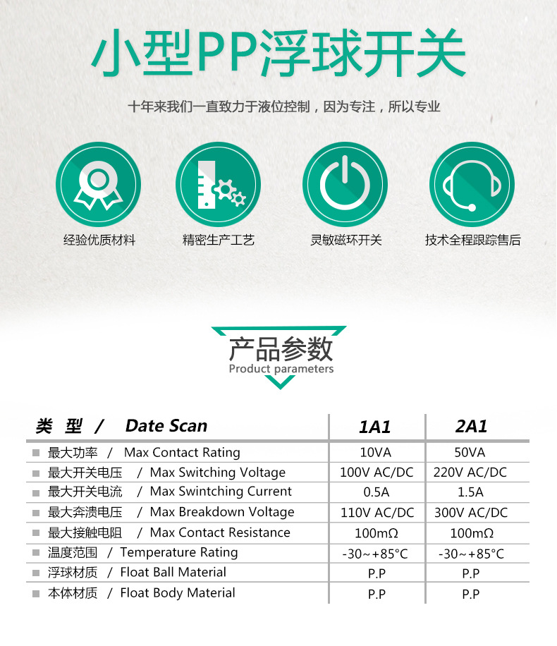 Miniature PP Liquid Level Float Switch (Water Level Sensor) for Water Tanks, HVAC Systems, and Industrial Applications, Made of Durable PP Material