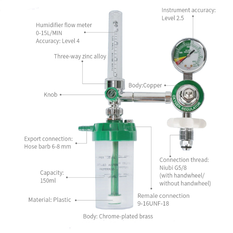 - Key Features: This oxygen flow meter includes a 0-15 L/min flow rate, a pressure gauge ranging up to 3500 psi (approximately 24 MPa), and an output pressure of 0.25 MPa, ensuring precise oxygen delivery.