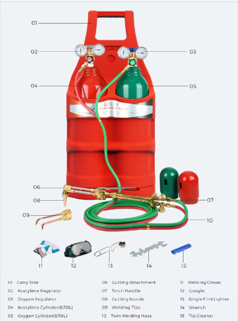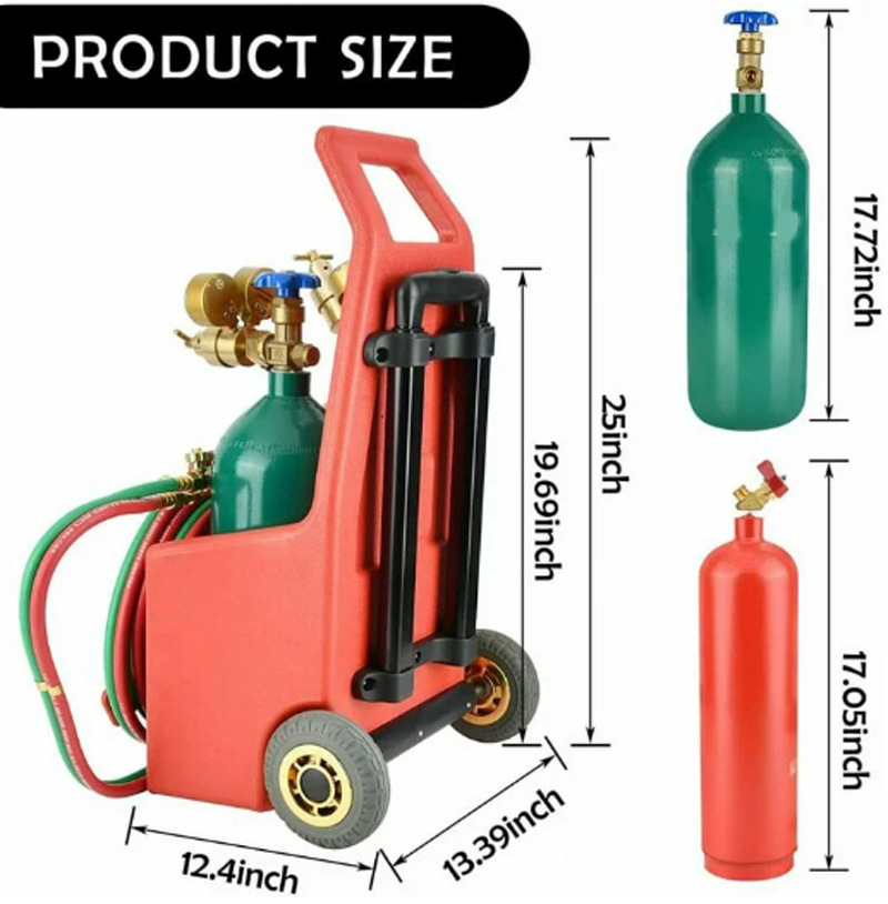 - What You Get: This comprehensive kit includes welding torch, cutting torch, two gas regulators, oxygen cylinder, acetylene cylinder, welding tips, cutting tip, gas hose, spark lighter, goggles, and a portable carrying stand.