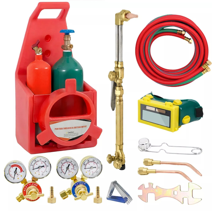 Portable Oxyacetylene Torch Kit Welding Brazing Cutting Tool System with Gas Cylinders, Hoses, Gauges