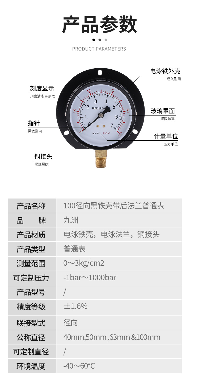 - Core Specs & Performance: Features a 100mm radial dial with a dual measurement range of 0-3 kg/cm2 and 0-100 Lb/in2. With an accuracy grade of ±1.6% and operating temperature range of -40 to 60°C, it delivers precise and consistent readings.