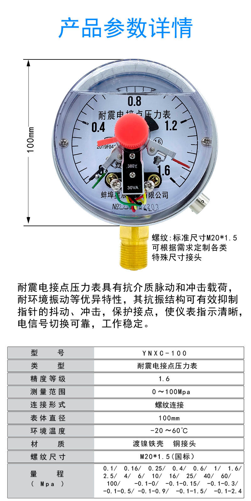 - Key Specs & Performance: Features a 0-1.6Mpa measurement range, 380V and 30VA electrical contacts, providing precise upper and lower limit control.