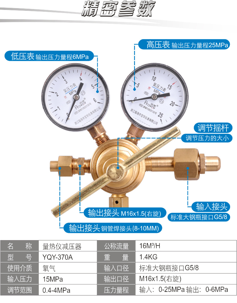 Provov YQY-370A Oxygen Pressure Reducer (6-25MPa) for Calorimetric Apparatus, Full Copper Body, One-Year Warranty