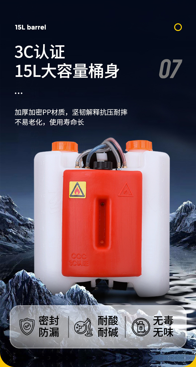 - Key Specs & Performance: Features a powerful 1.5L/minute fog output, dual 7.5L chemical tanks, 2L fuel tank, and 3L/h fuel consumption, providing efficient and extensive coverage.