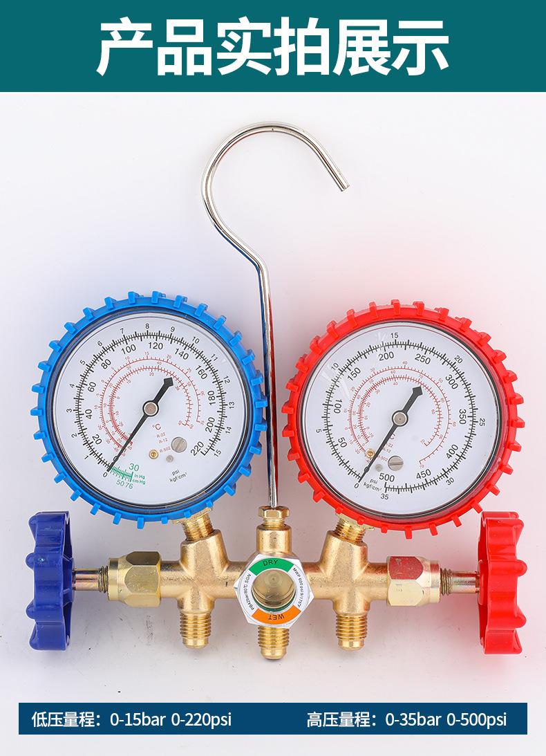 R134a AC Refrigerant Manifold Gauge Set (Low Pressure 0-15bar/0-220psi, High Pressure 0-35bar/0-500psi) for Automobile Air Conditioning System