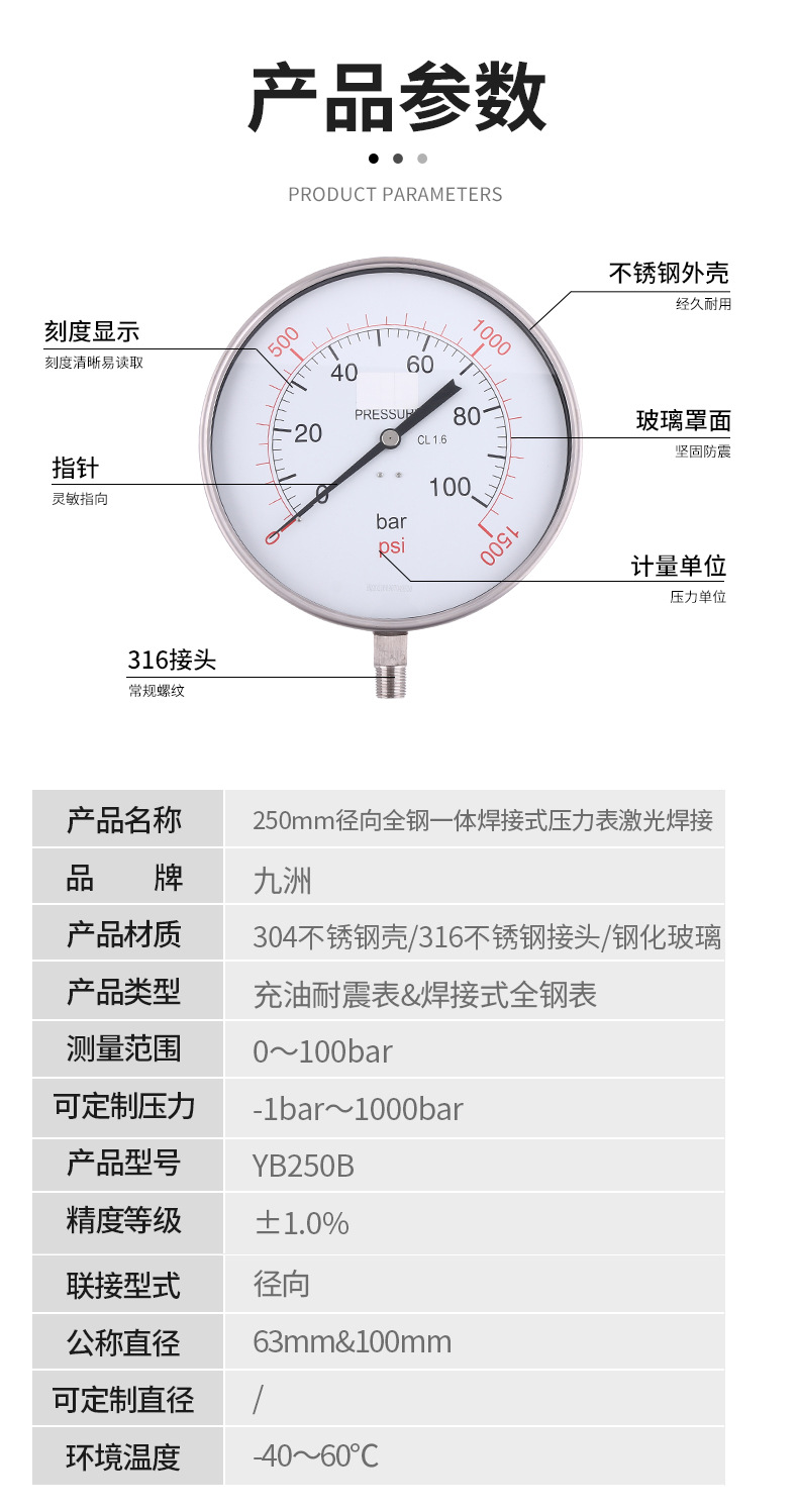 - What You Get: Includes one 250mm radial all-steel welded pressure gauge, model YB250B. Manufactured by a source factory with customizable pressure options (-1bar to 1000bar) and support, ensuring quality and fit for diverse applications.