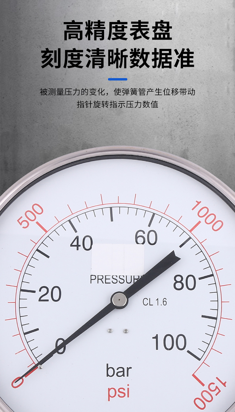 Radial All-Steel Welded Pressure Gauge 250mm CL1.6 0-100 bar/0-1500 psi for HVAC Systems Replaces YB250B