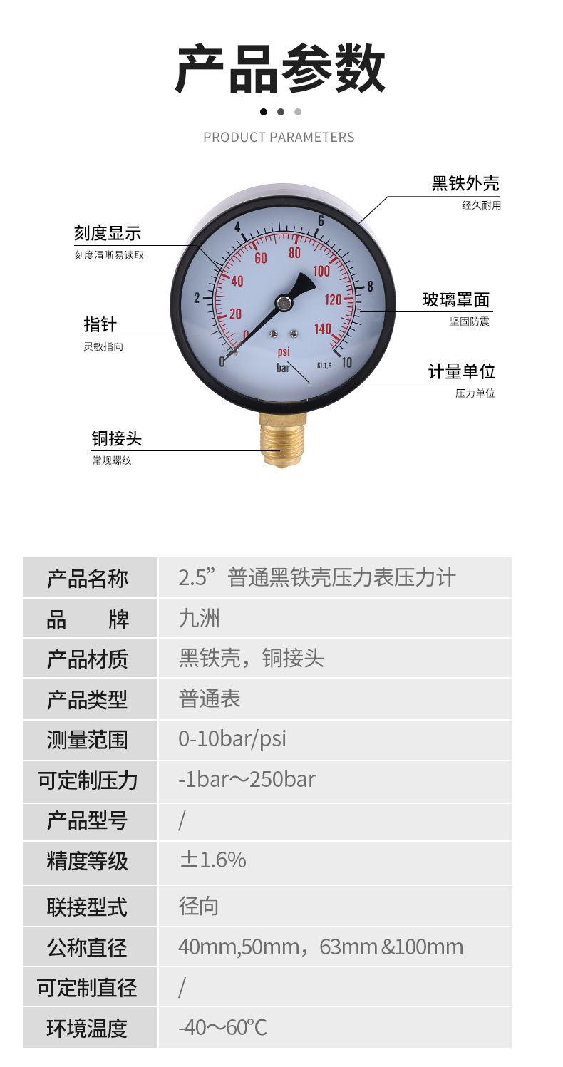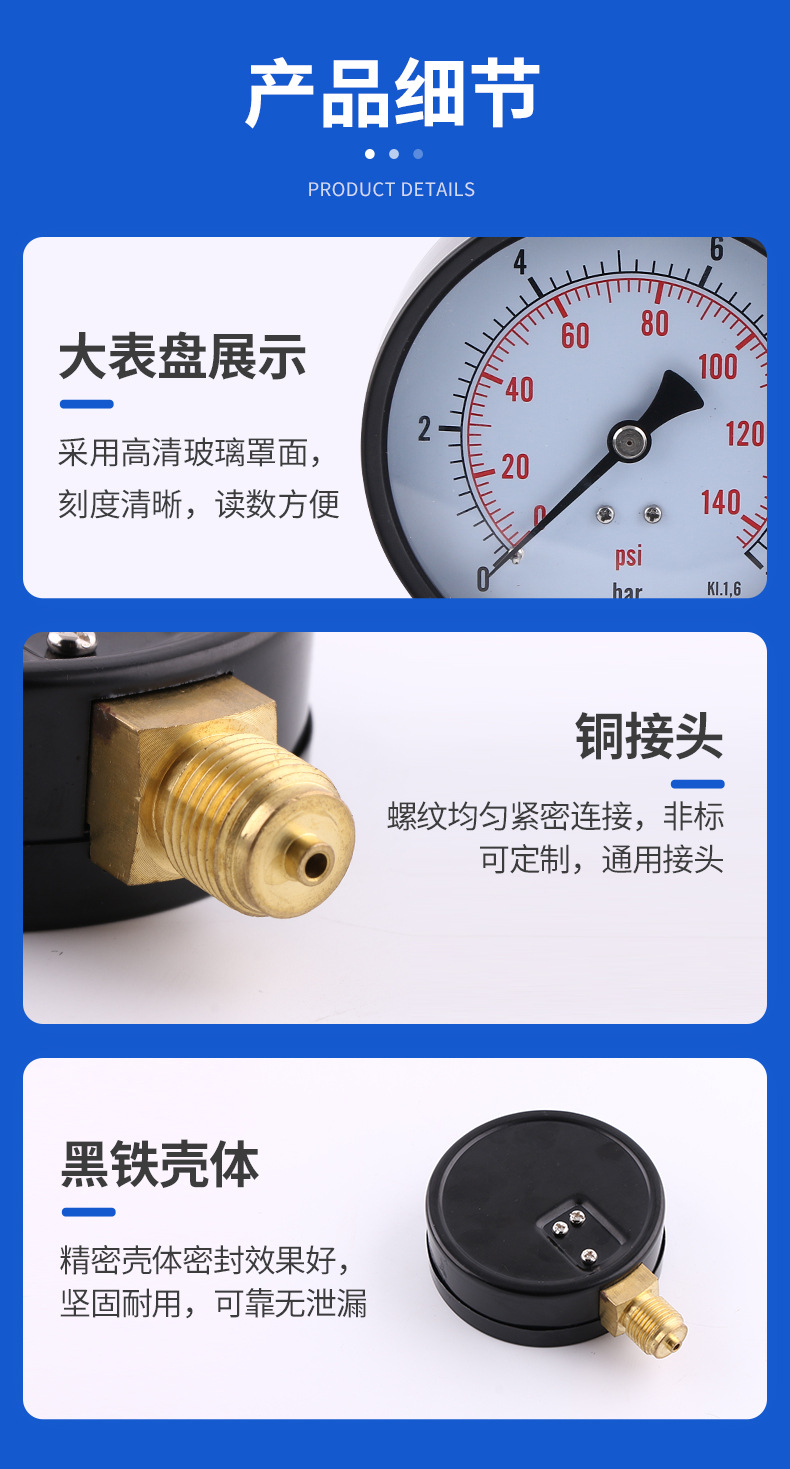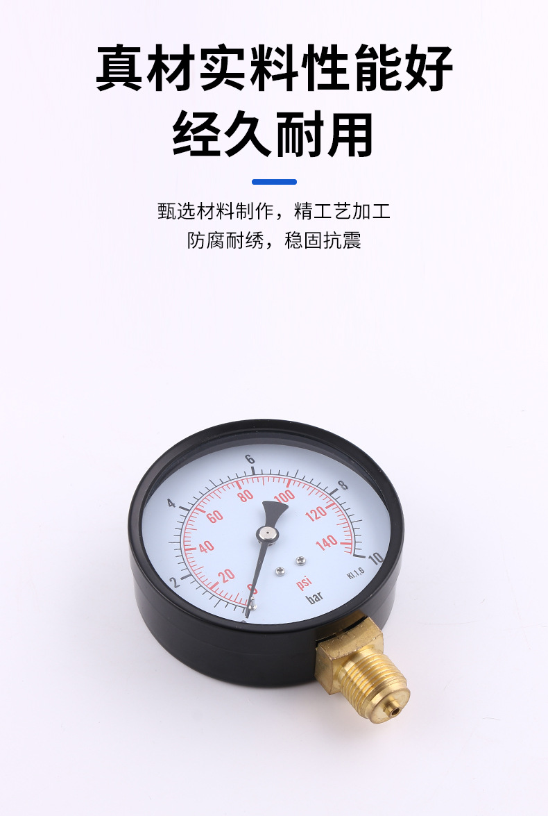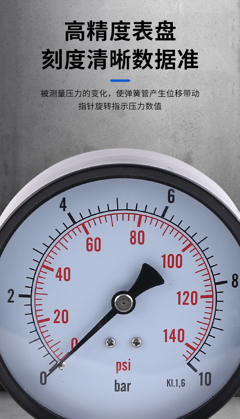 - Key Specifications: Features a 2.5-inch dial, a measuring range of 0-10bar/psi, and a KI 1.6 accuracy class for precise pressure readings.