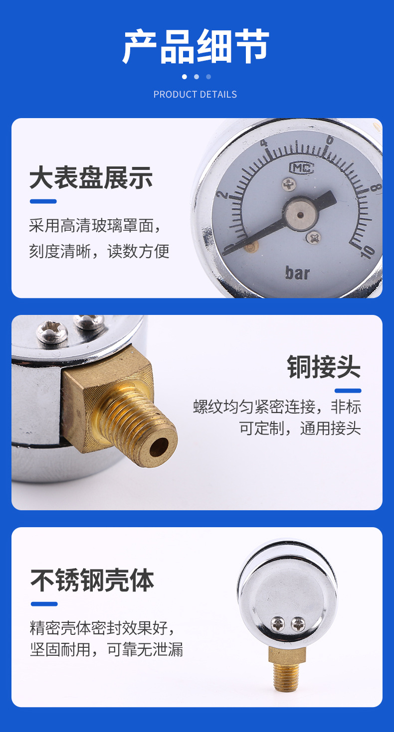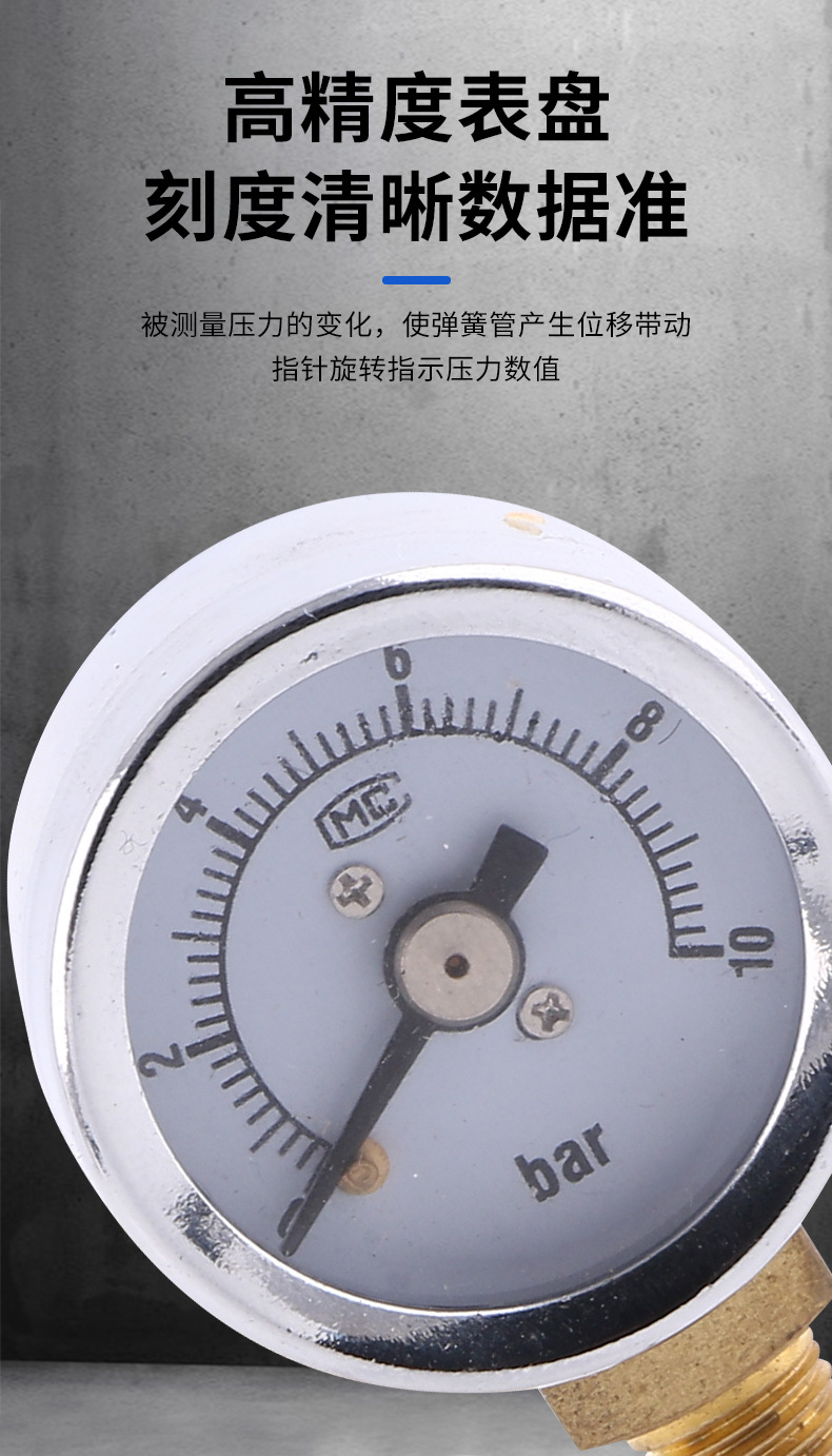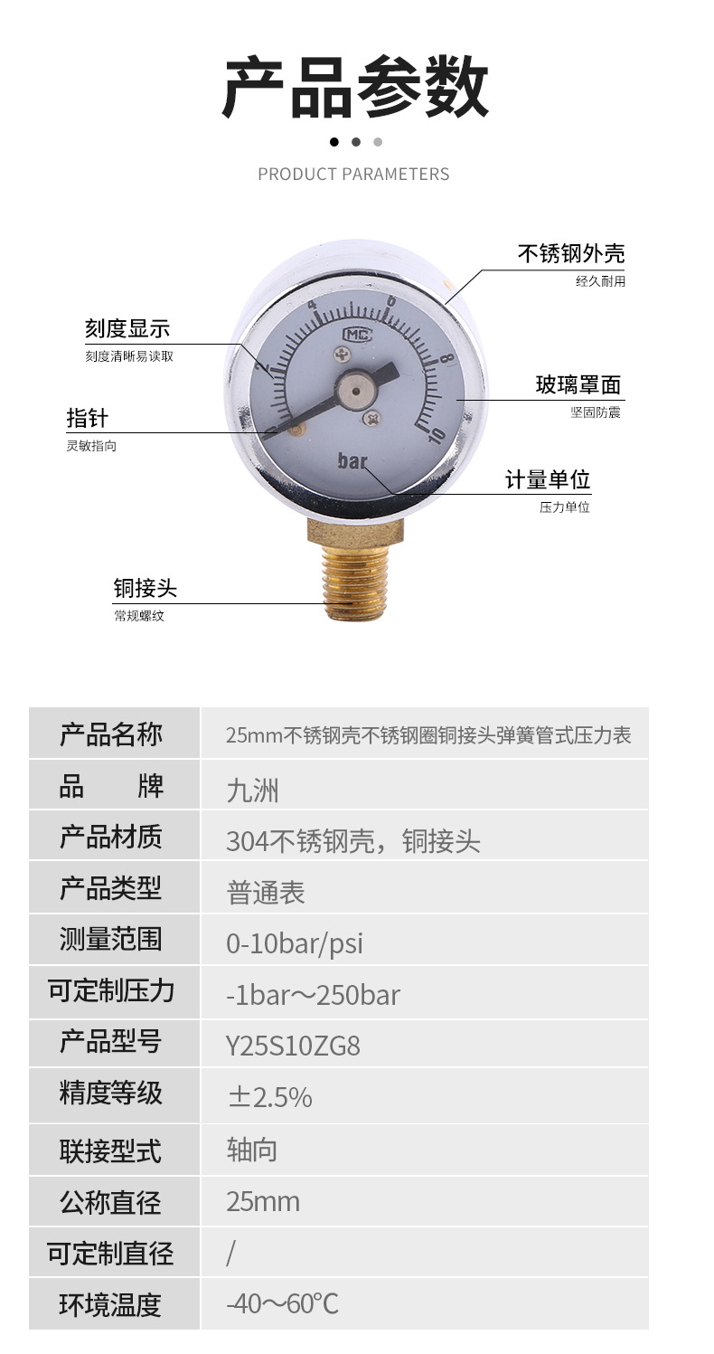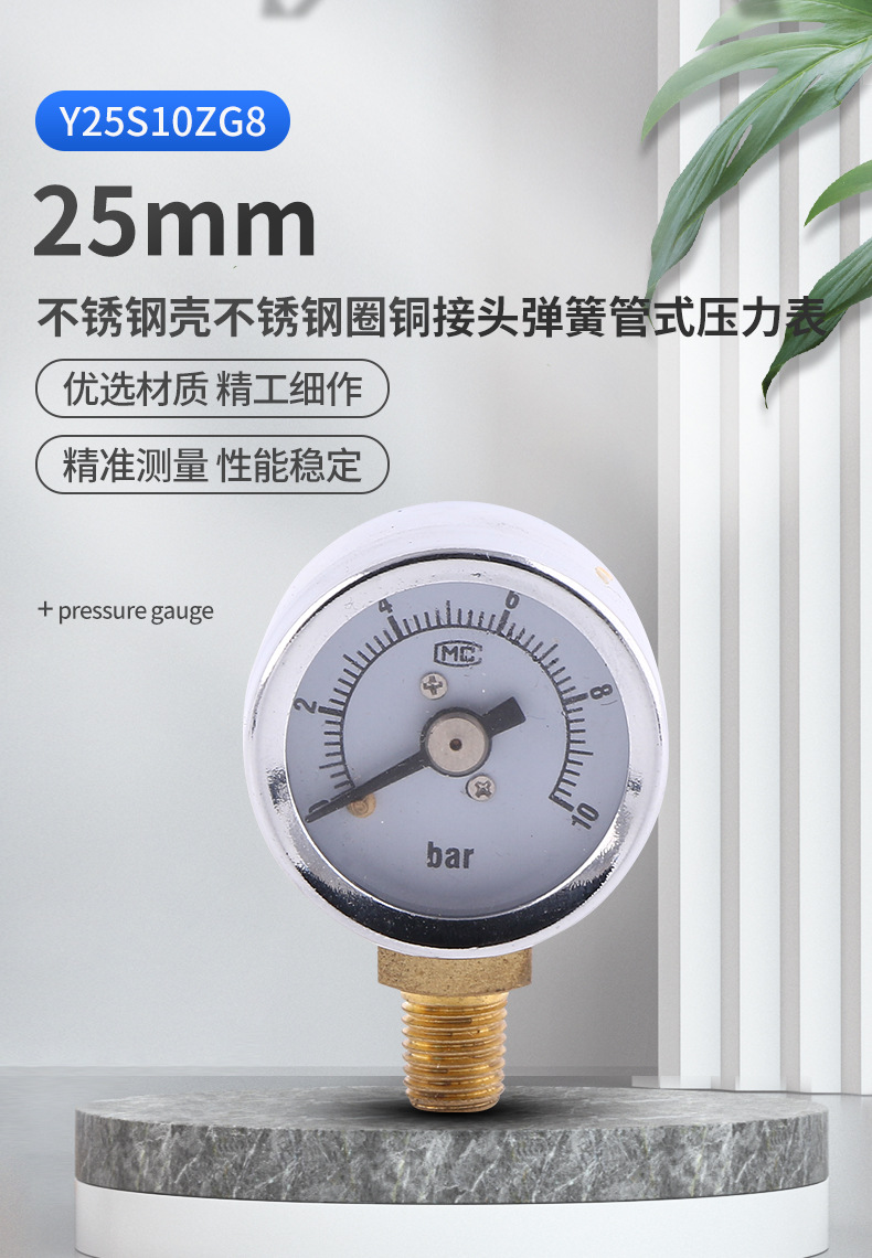 Radial Pressure Gauge 25mm Stainless Steel Case Copper Joint Bourdon Tube Pressure Gauge 0-10 Bar Model Y25S10ZG8