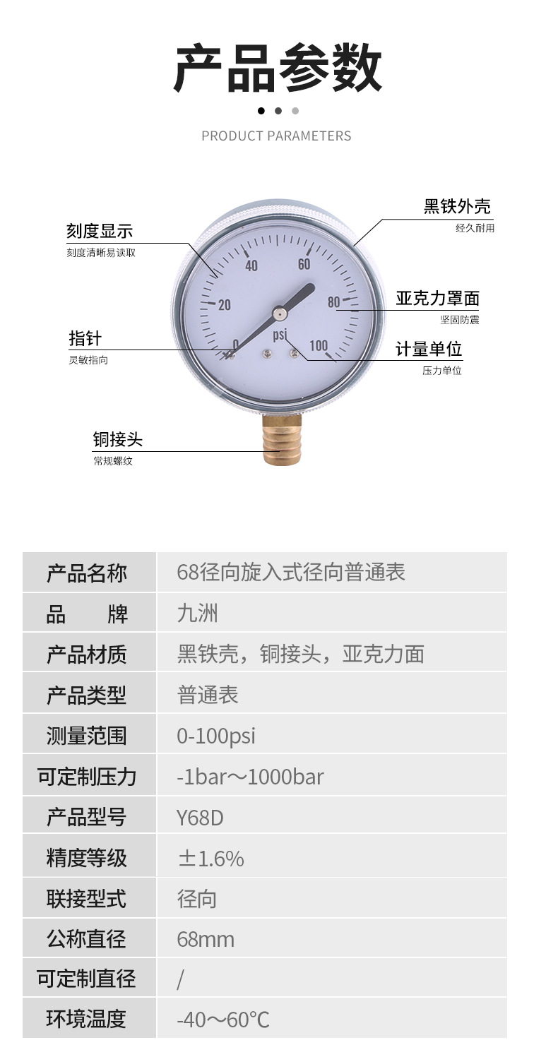 - What You Get: One high-quality Y68D radial pressure gauge, meticulously crafted for reliable pressure measurement in diverse temperature ranges (-40℃ to 60℃).