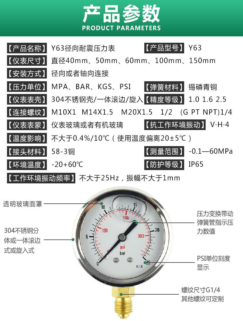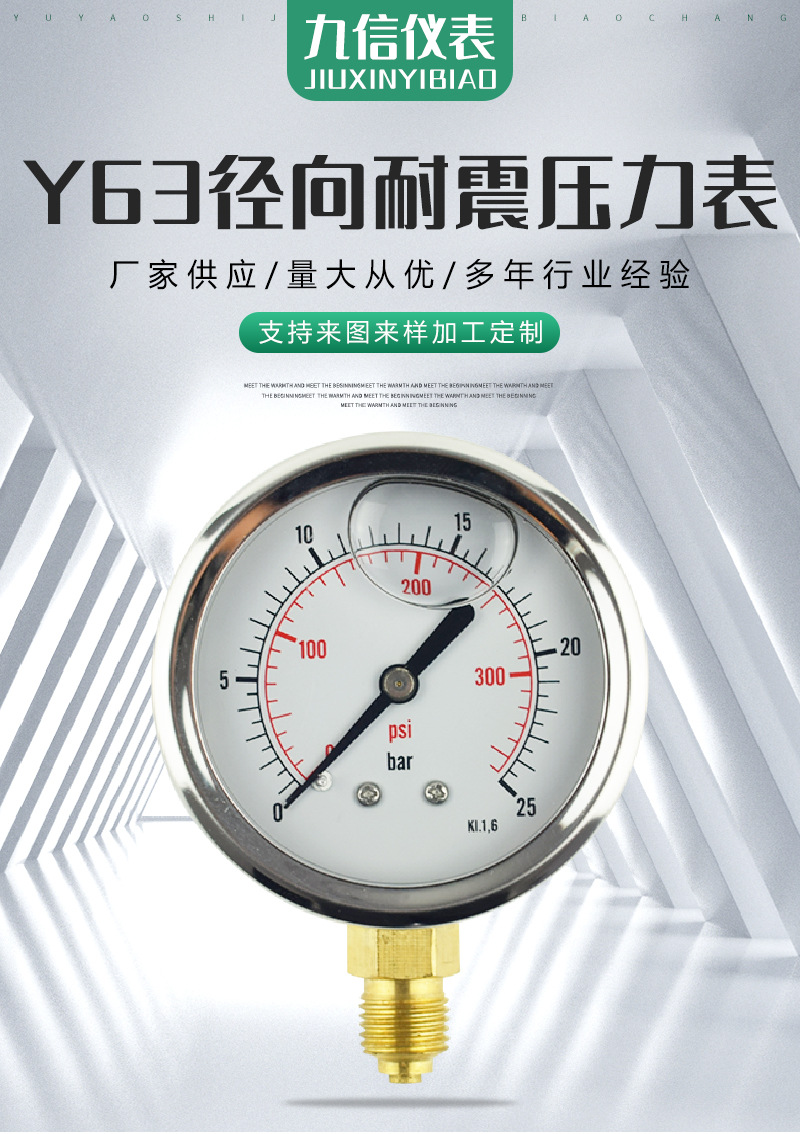 Radial Seismic Pressure Gauge y63 (0-25 bar, 0-300 psi, KL1.6) Stainless Steel Casing Copper Thread Connection for Oil, Air, Liquid, Water Pressure