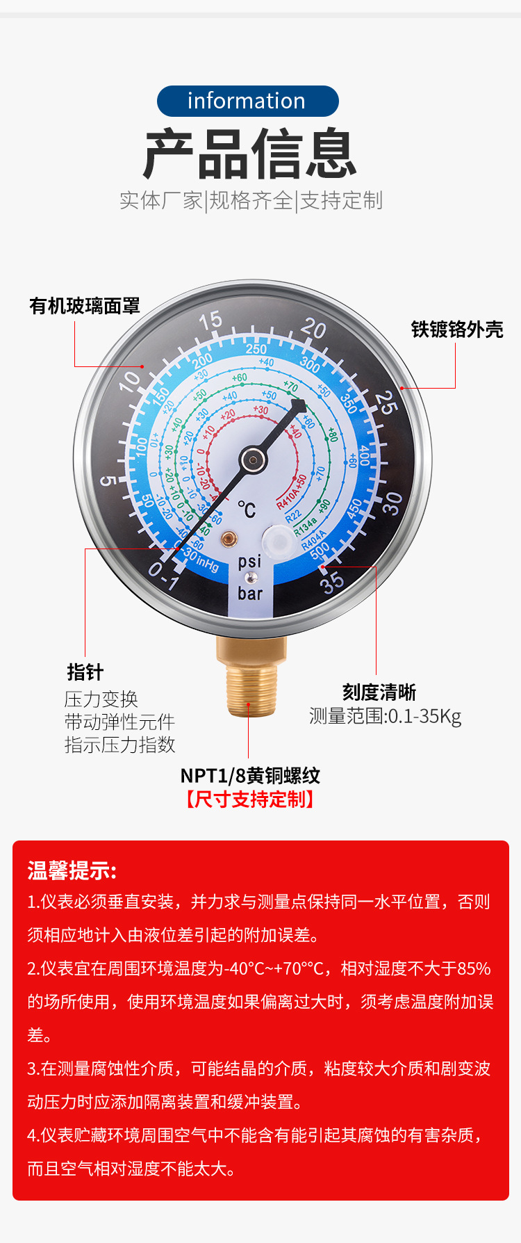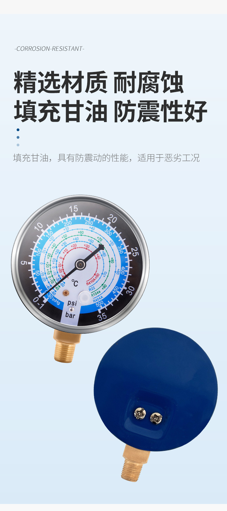 - Compatibility: Universal Refrigerant Gauge compatible with widely used HVAC refrigerants including R22, R134a, R404A, and R410A, ideal for ice storage and refrigeration equipment.