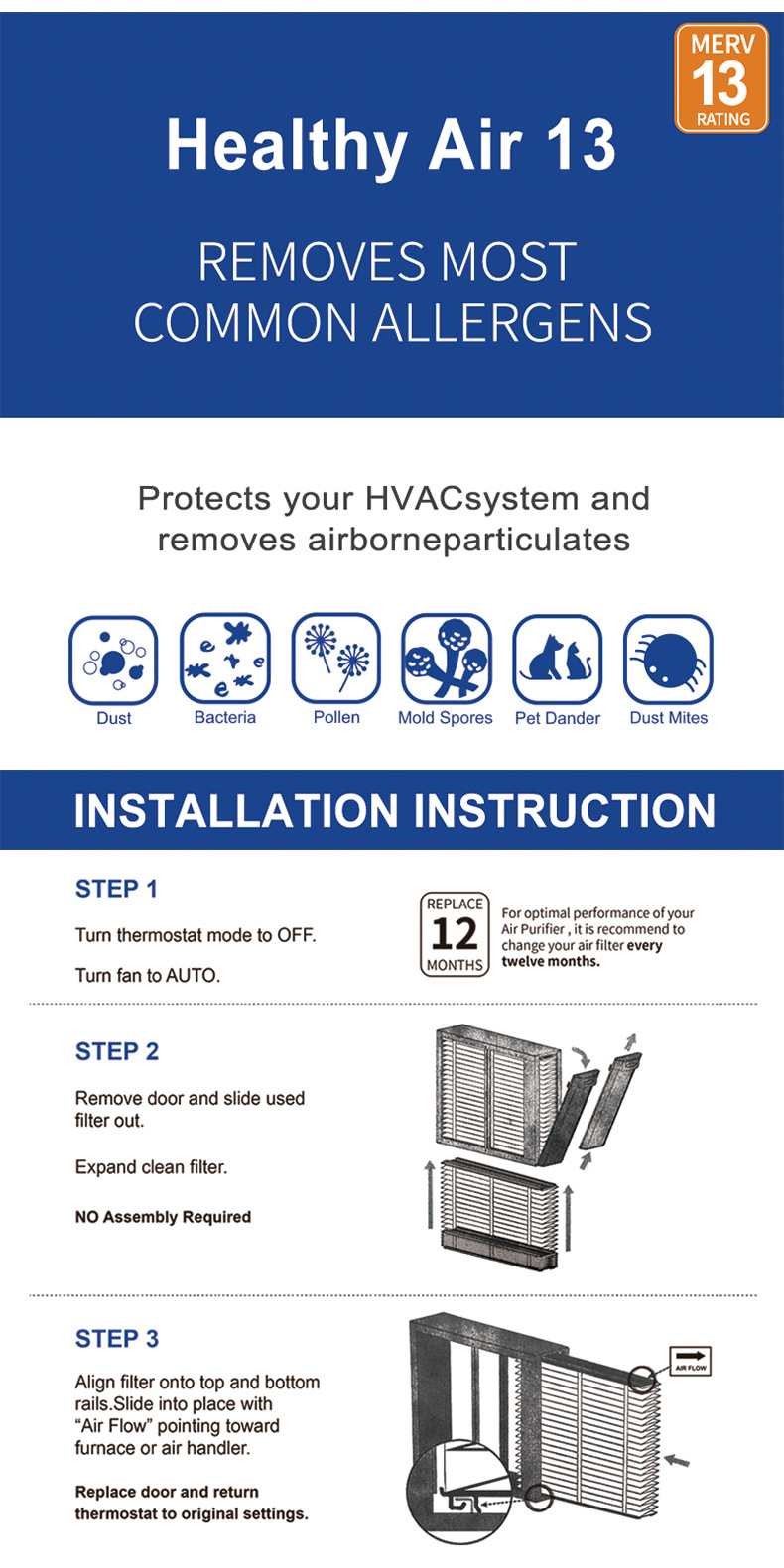- Premium Filtration Quality: Constructed with high-grade pleated MERV13 media, certified by EPA, ROHS, and SGS, effectively capturing dust, pollen, mold, bacteria, pet dander, and dust mites.