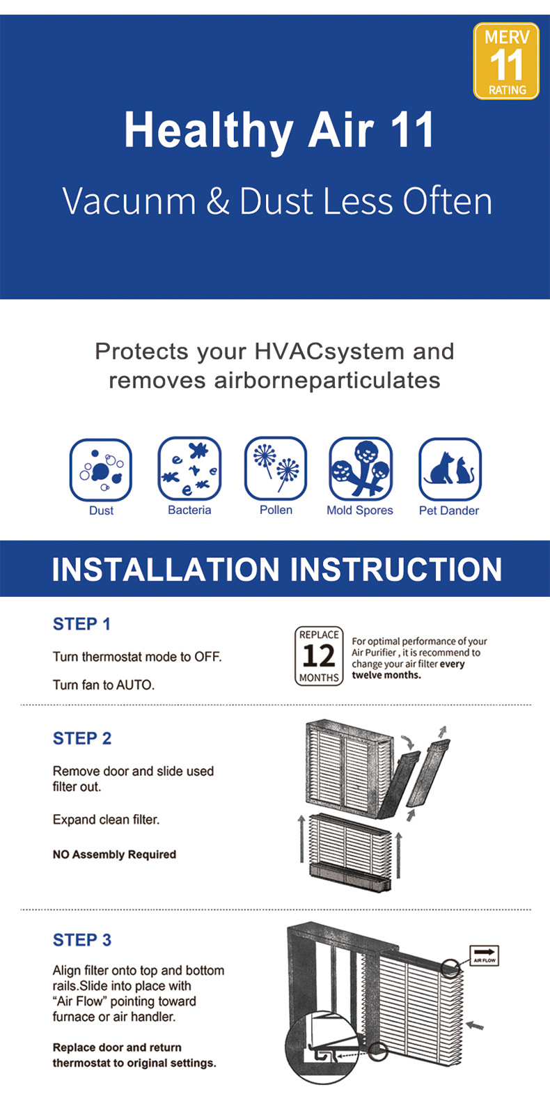 - Premium Filtration: Features MERV 11 filtration efficiency, effectively capturing dust, pollen, mold spores, bacteria, pet dander, and dust mites from your air.