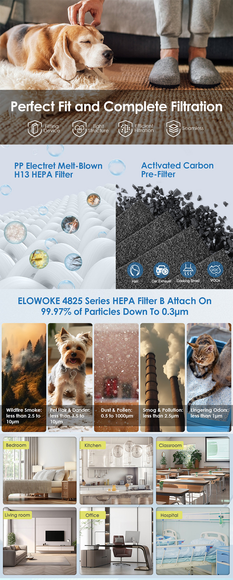 - Premium Filtration: Features a high-efficiency HEPA filter combined with an activated carbon pre-filter to capture 99.97% of airborne particles as small as 0.3 microns, including pollen, pet dander, and dust.