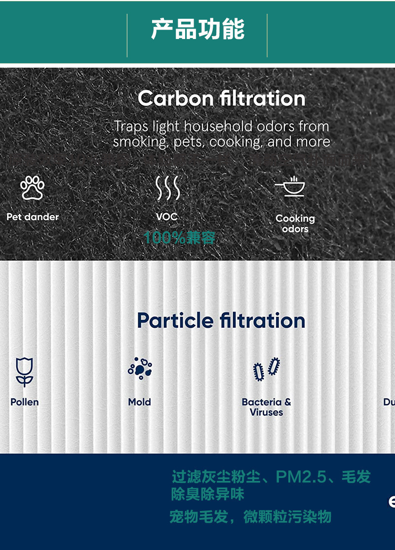 - Premium Filtration Performance: Features a multi-layer filtration system, including activated carbon and HEPA-like media, effectively capturing 0.3-micron particles, dust, pollen, pet dander, and odors.
