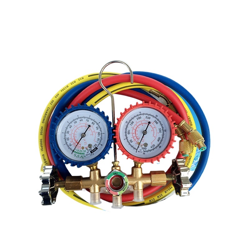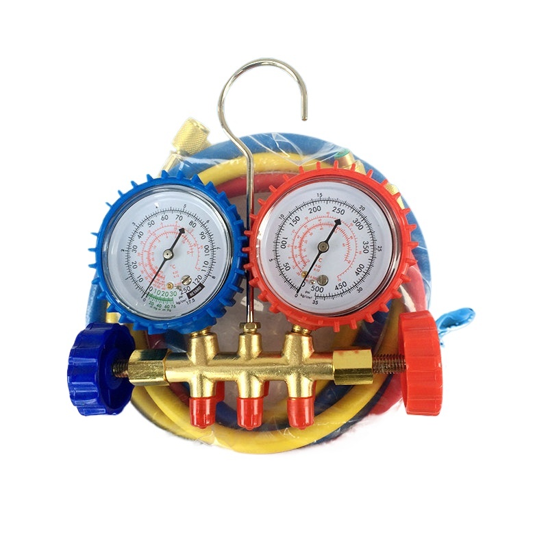 - Quality & Durability: Features a robust brass manifold body and durable rubber hoses in red, yellow, and blue colors, ensuring longevity and reliable performance.
