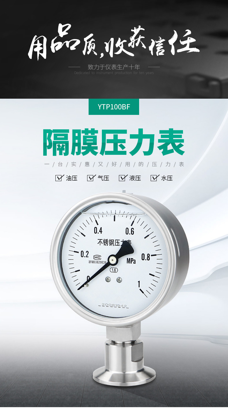 - Wide Compatibility: YTP100BF Diaphragm Pressure Gauge compatible with various media like water, gas, oil, and liquid pressure systems.