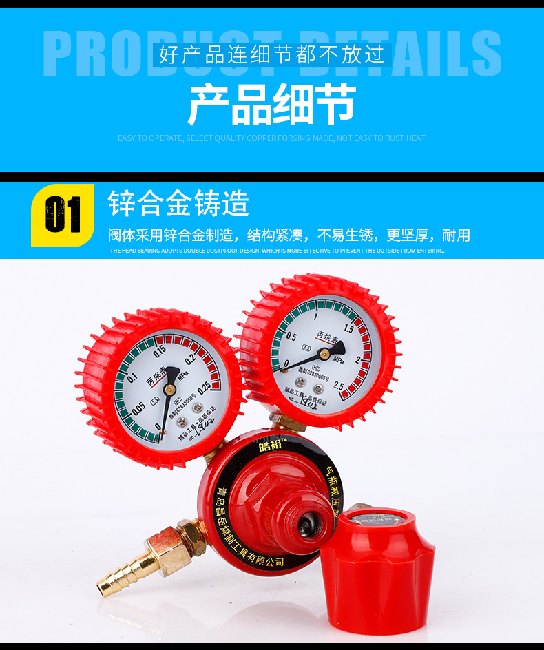 - Key Specs & Performance: Features dual gauges with a primary range of 0-0.25 MPa and a secondary range of 0-2.5 MPa, providing precise pressure regulation for optimal propane flow.