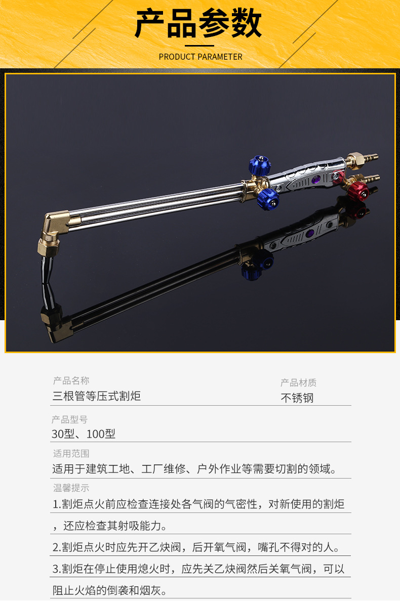 Stainless Steel Anti-Tempering Cutting Torch (Three Pipe Equal Pressure) for Industrial Welding and Cutting Operations, Compatible with Oxygen-Acetylene Gas