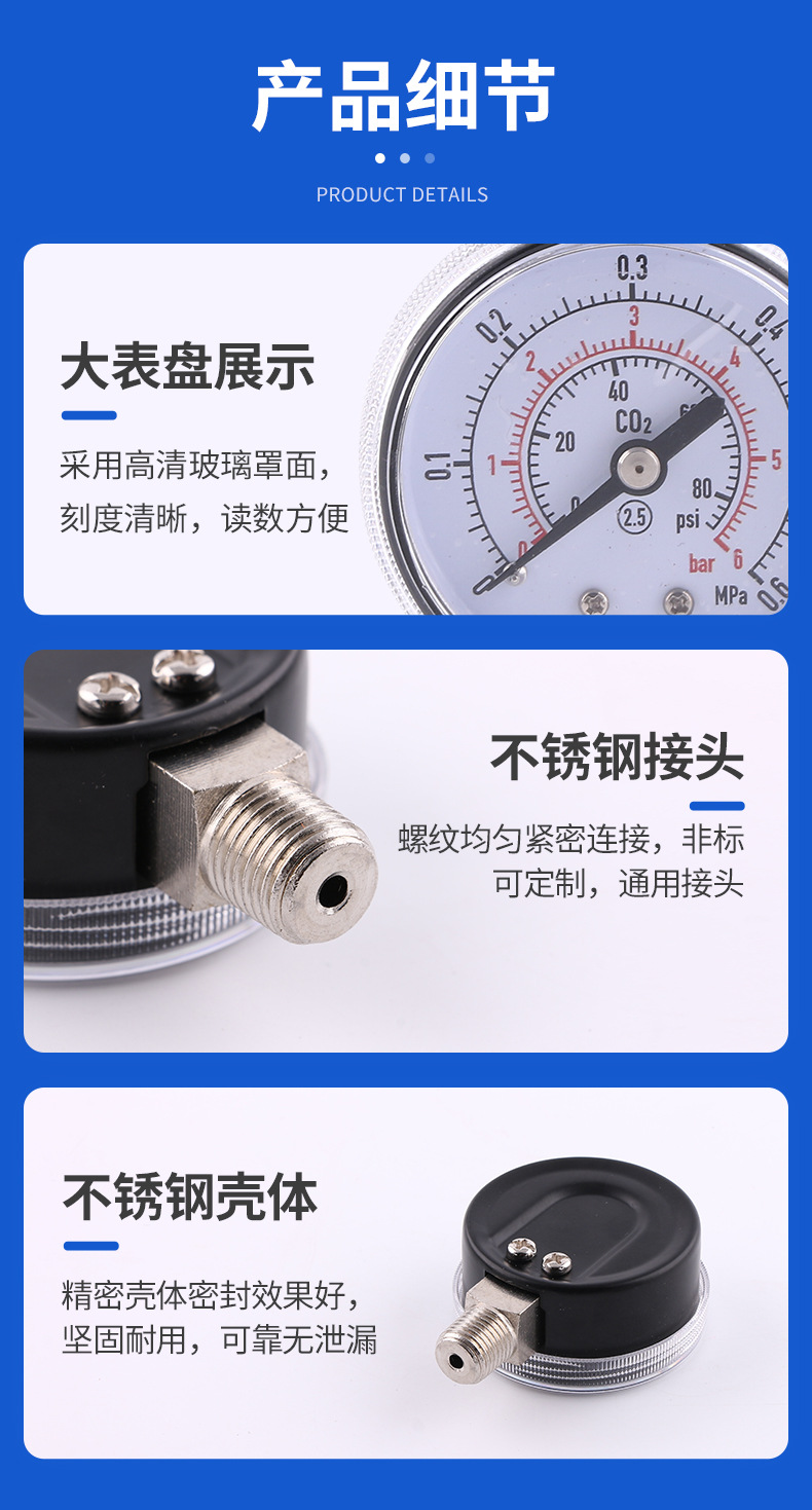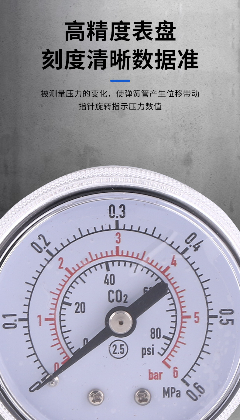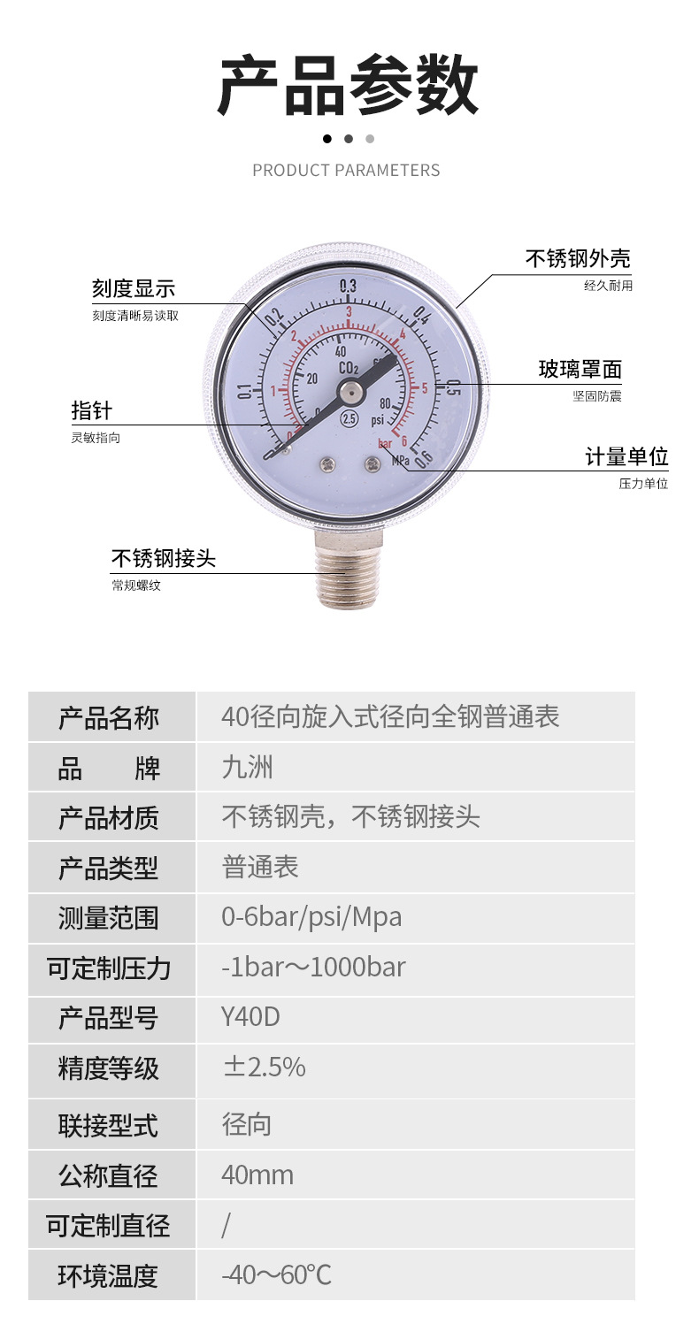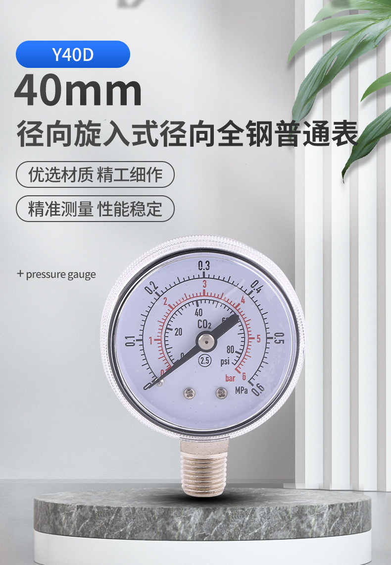 - Key Specification: Features a 40mm nominal diameter, 0-6 bar/psi/Mpa measurement range, and Y40D model, suitable for various pressure monitoring applications.