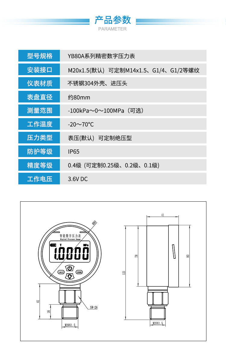 - What You Get: One YB-80HA stainless steel digital pressure gauge, complete with advanced features for high-precision pressure monitoring and customizable range options.