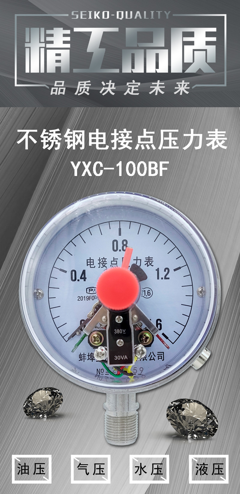 - Wide Compatibility: YXC-100BF series electric contact pressure gauge is universally compatible with water, air, oil, and hydraulic systems, offering versatile application.