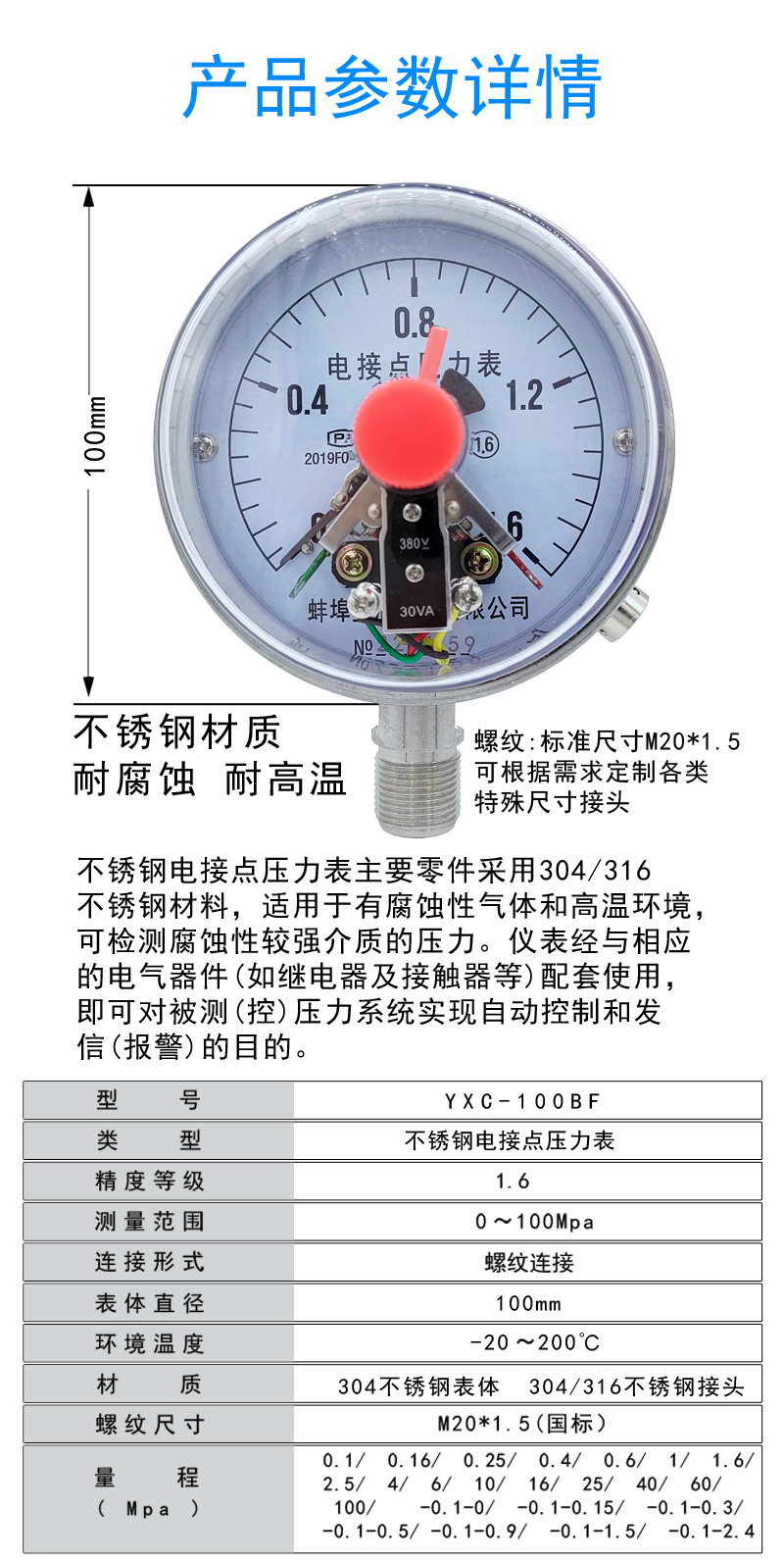 - What You Get: Includes one stainless steel electric contact pressure gauge (YXC-100BF series, 380V, 30VA), providing essential pressure monitoring and control for various industrial applications.