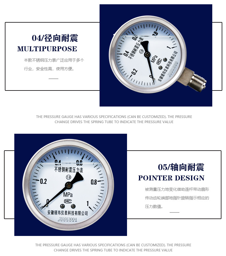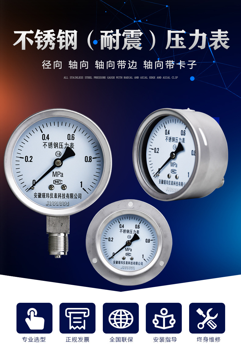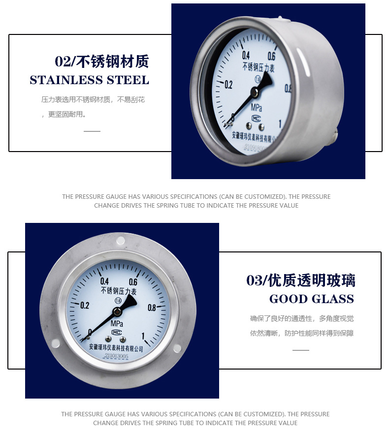Full Stainless Steel Pressure Gauge Internal Structure 100mm Radial All-Steel Integrated Welded Low-Pressure C-Type Tube