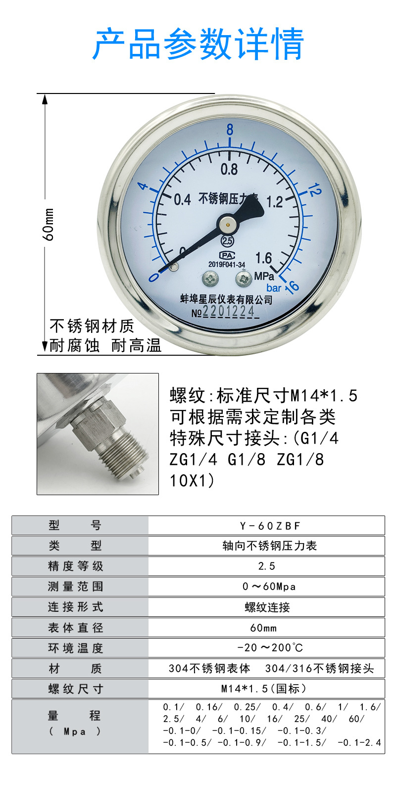 - Key Specs & Performance: Features a 60mm nominal diameter and 2.5 accuracy class, providing precise pressure measurements for reliable system monitoring. Available in multiple pressure ranges from -0.1 to 100 MPa to suit diverse requirements.