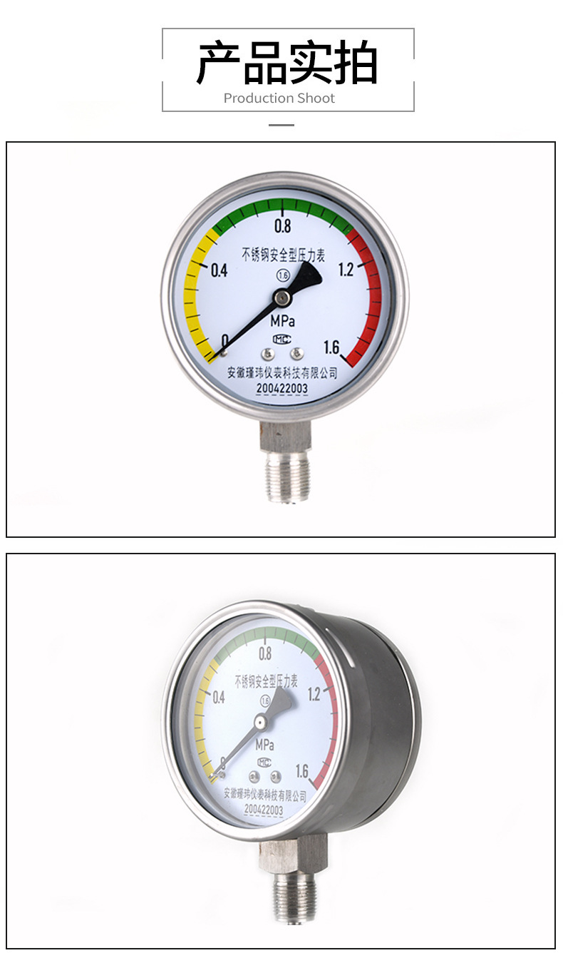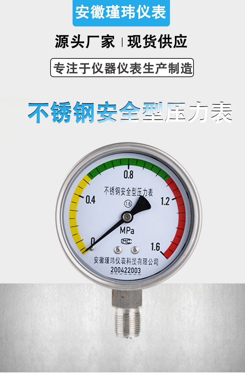 Stainless Steel Safety Pressure Gauge (0-1.6MPa, 1.6 Accuracy, M20*1.5 Thread) for Water/Oil/Gas Systems, Replaces Jinwei Instrument Pressure Gauges