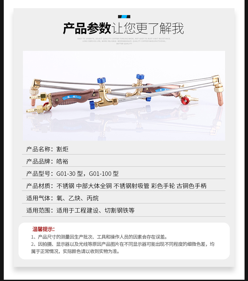 - Wide Compatibility: Specifically designed for oxygen acetylene cutting applications, compatible with G01-30 and G01-100 models, ensuring broad utility for various welding tasks.