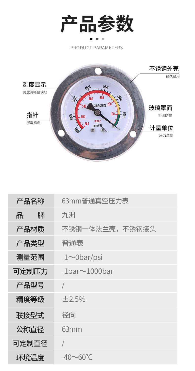 - What You Get: One 63mm Stainless Steel Vacuum Pressure Gauge with Front Flange. Perfect for monitoring vacuum levels in HVAC, refrigeration, and laboratory settings, ensuring operational efficiency and safety.