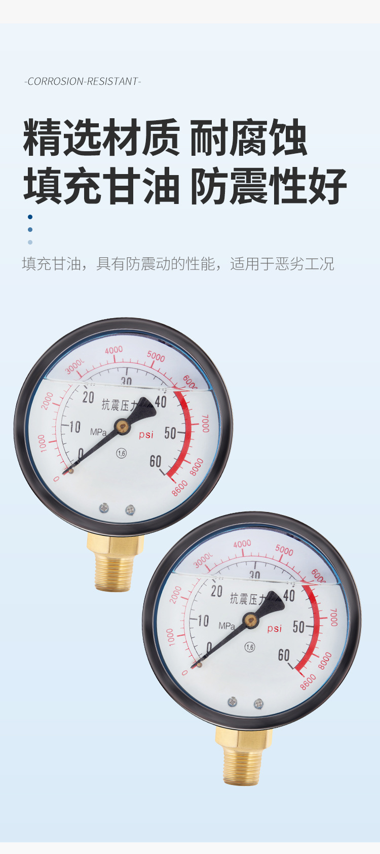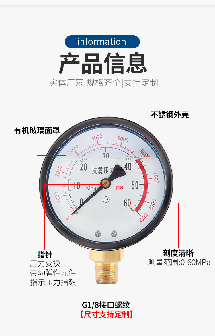 - Key Specs & Performance: Features a 0-60 MPa (0-8600 psi) measuring range with high accuracy (1.6 class) for precise readings, and a shock-resistant design for stable operation.