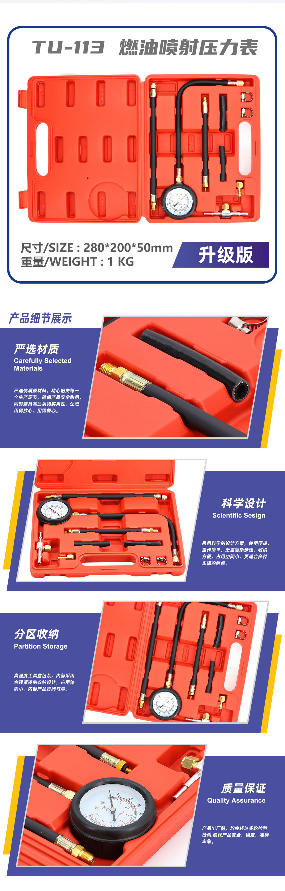 - Wide Compatibility: TU-113 Fuel Pressure Gauge is designed for universal application, compatible with various automotive fuel injection systems for accurate testing.