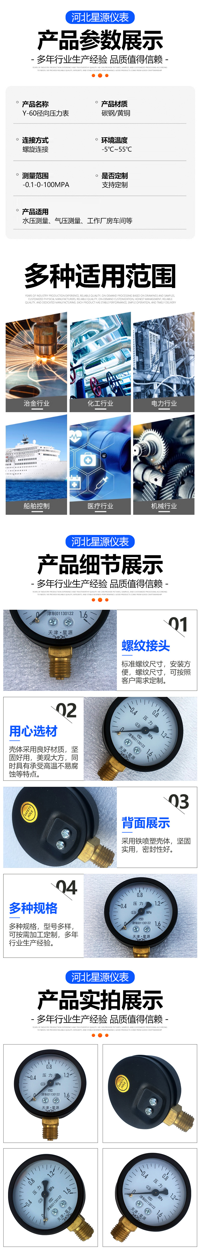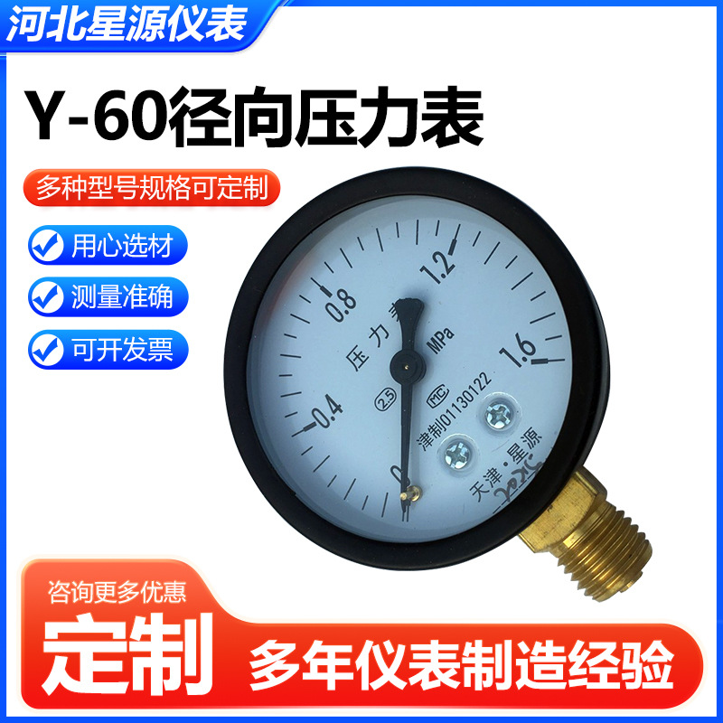 Tianjin Xingyuan Axial Pressure Gauge Y-60 Series (0-1.6 MPa, Threaded Connection, Custom Range) for Water, Air, Steam Systems