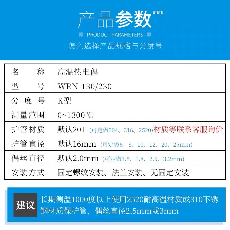 WRN/WZP-130/230 K-Type Pt100 Stainless Steel Thermocouple RTD High Temperature Sensor Probe