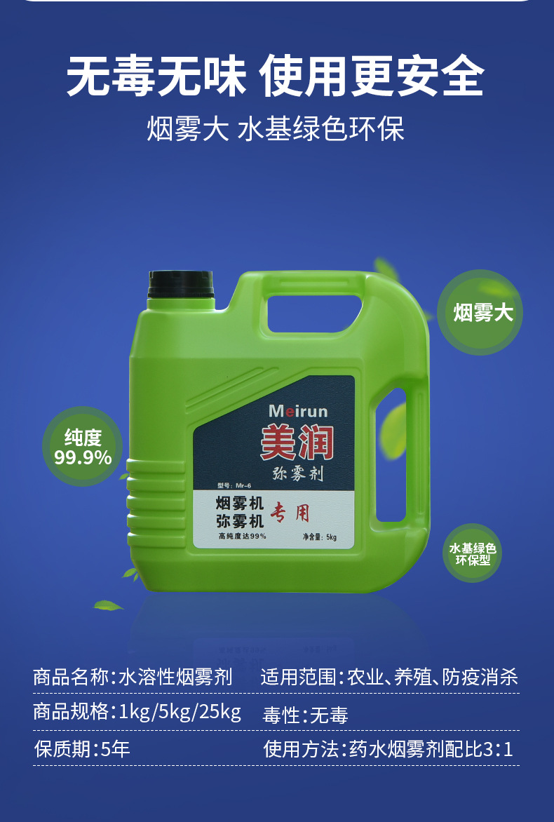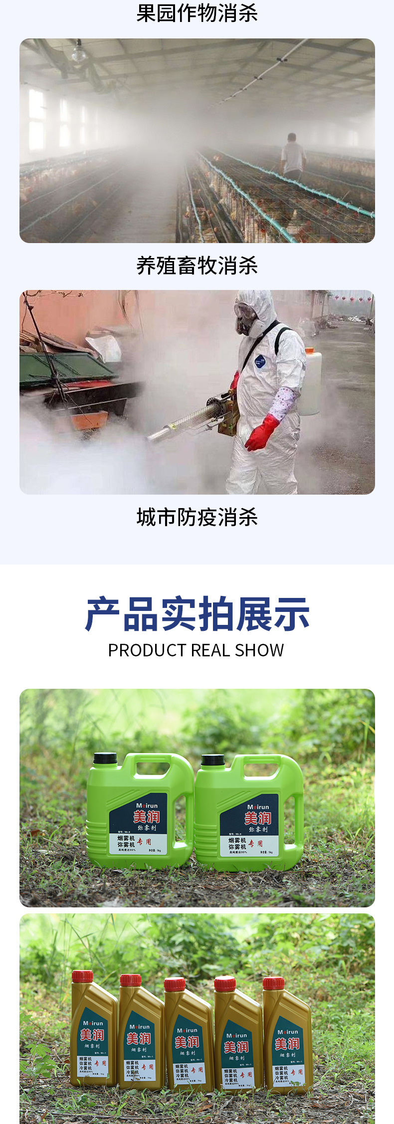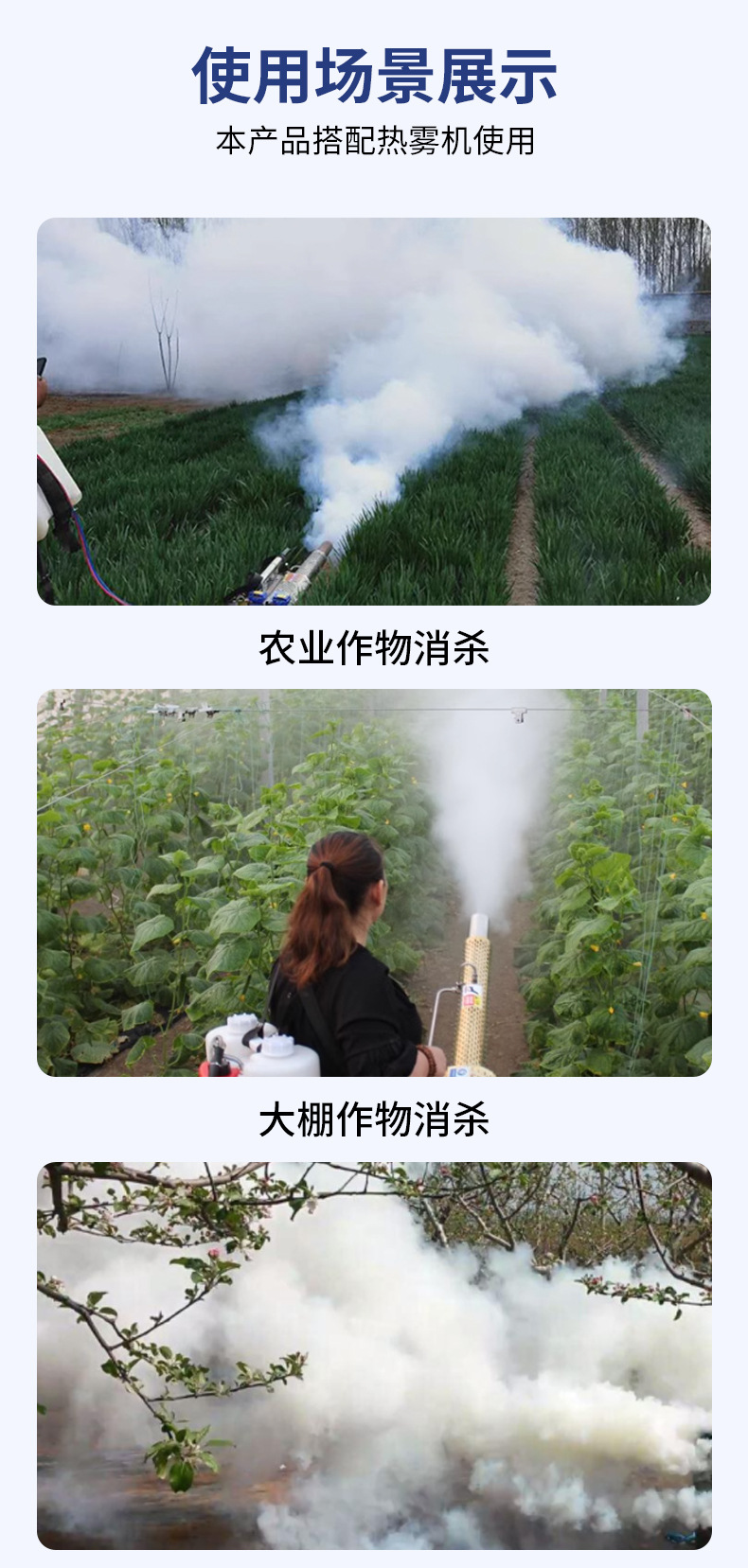- Easy Application: This fogging agent is water-soluble, allowing for easy mixing and application, suitable for agricultural spraying, breeding disinfection, and environmental sanitation.