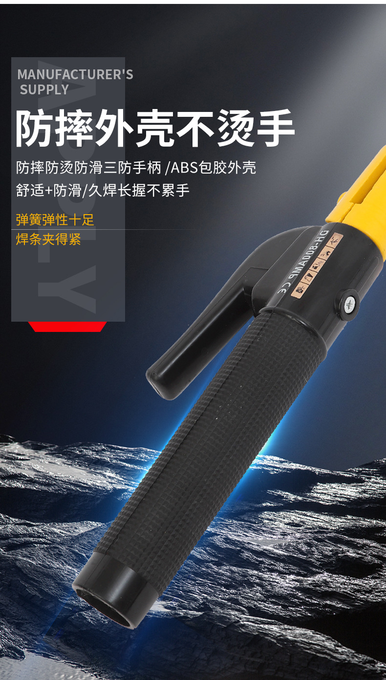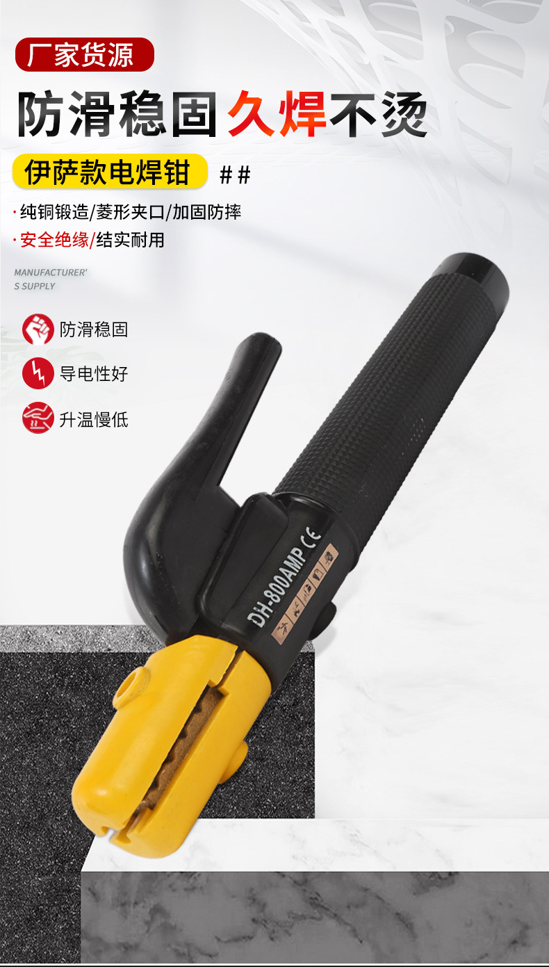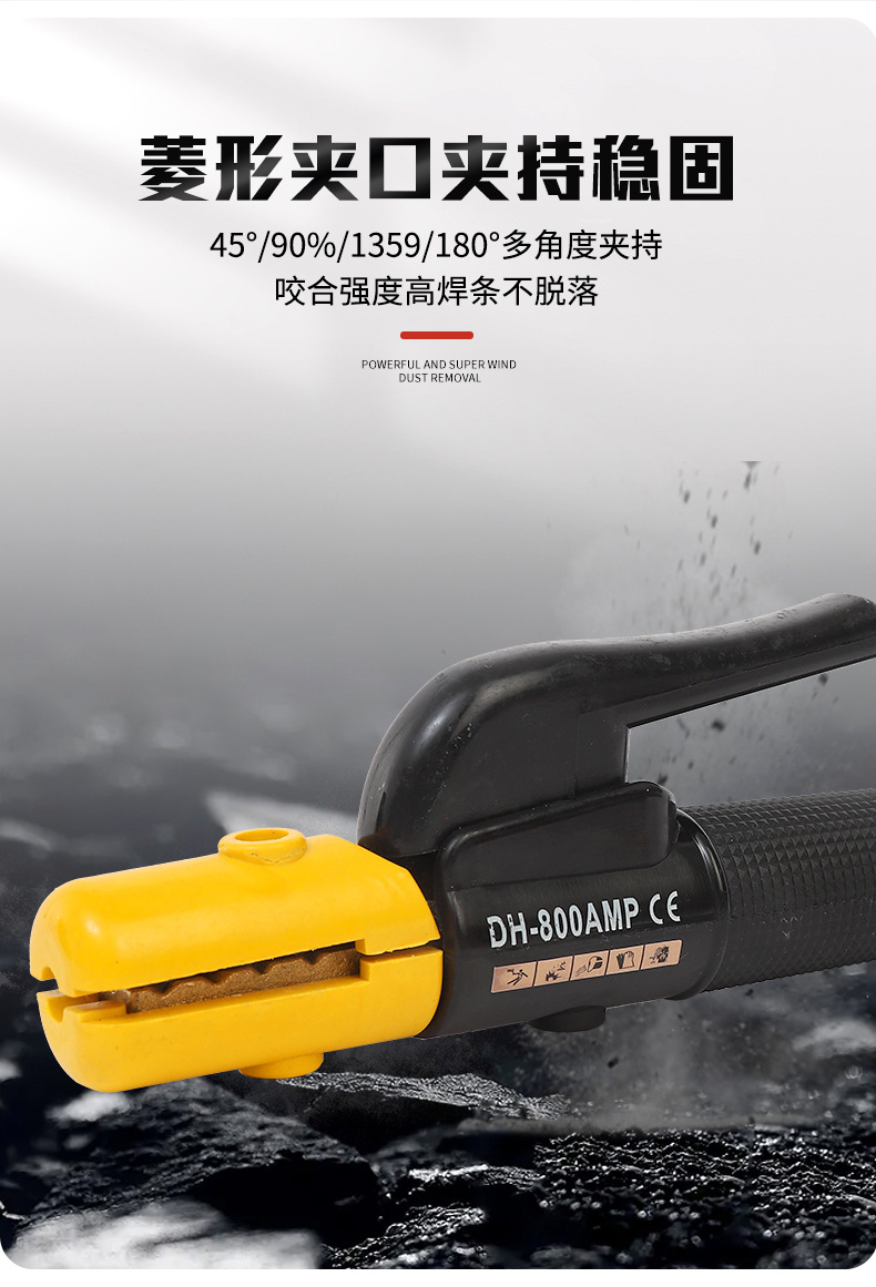 - Key Specification: Heavy-duty DH-800AMP CE electrode holder rated for 800A, ensuring strong electrical conductivity and stable arc performance for demanding welding tasks.