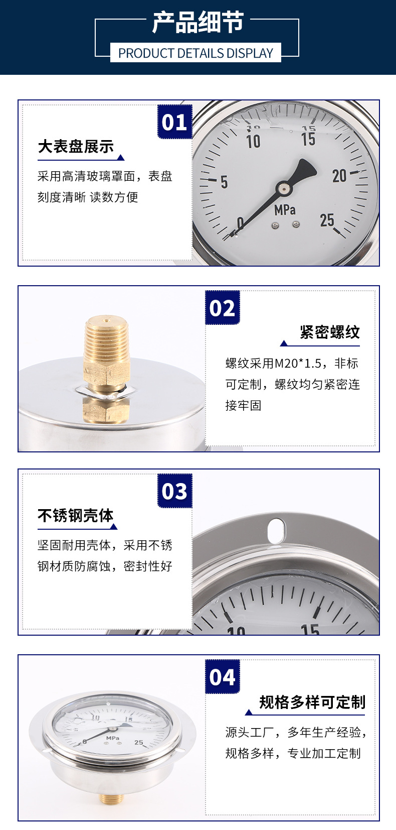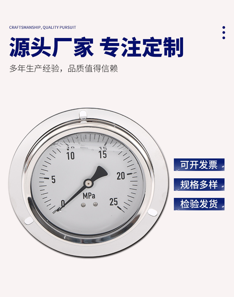 - Key Specs & Performance: Features a measuring range of 0.1-25 MPa (0-25 MPa indicated on gauge face) with a precision grade of 1.6, and a nominal diameter of 100mm for clear readings.