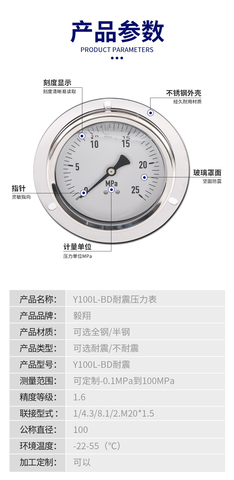 Y100L-BD Seismic Pressure Gauge 0-25 MPa Diameter 100mm with M20*1.5 Connection for Water/Oil Pressure and Vacuum Systems