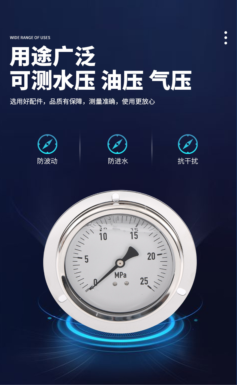 - Wide Compatibility: Y100L-BD seismic pressure gauge suitable for various industrial applications including water pressure, oil pressure, and vacuum measurement systems.