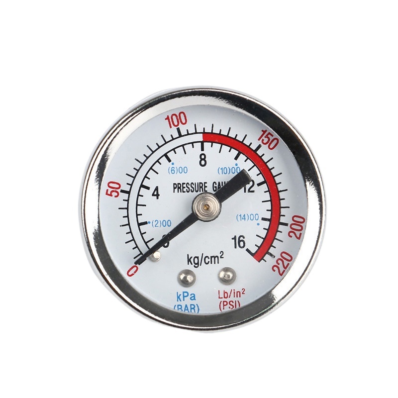 - Key Specifications: Features a clear dial with ranges of 0-220 PSI (pressure gauge), 0-16 kg/cm², and 0-16 BAR, ensuring precise pressure readings for various applications.