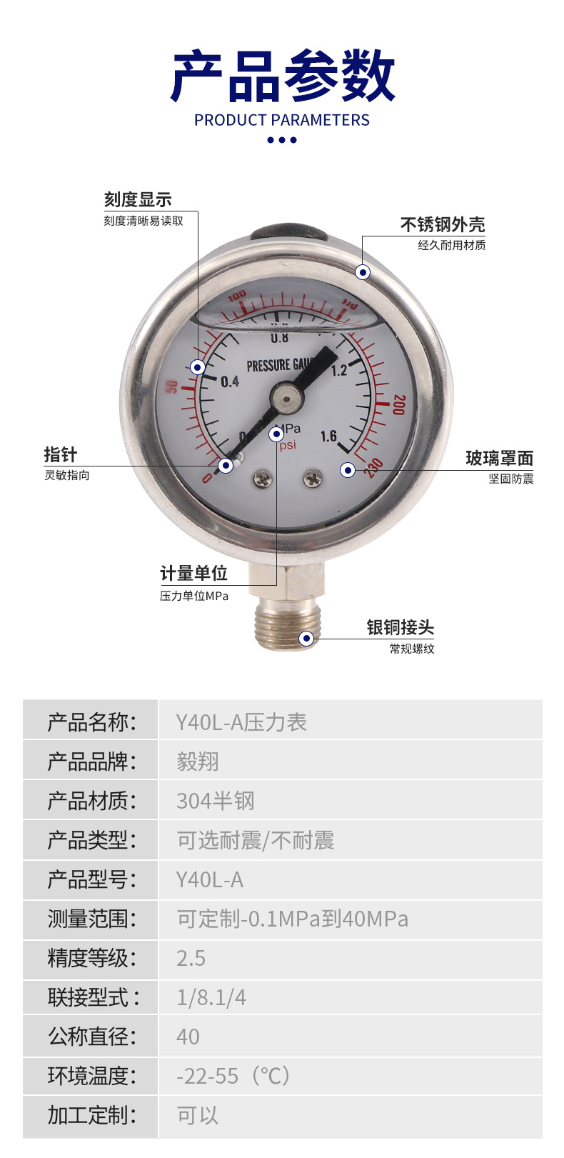- What You Get: One Y40L-A Pressure Gauge, designed for durability and precise measurement. Customization is available to meet specific application needs, ensuring a perfect fit for your system.