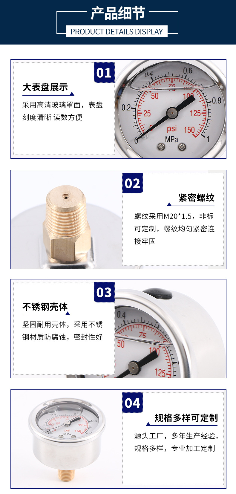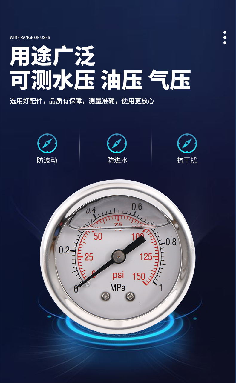 - Key Specs & Performance: Measures pressure from 0-1 MPa (0-150 psi) with 1.6 accuracy class and anti-vibration features, providing precise and stable readings for critical monitoring.