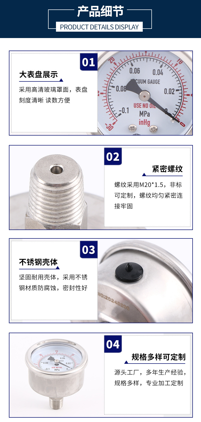 - Easy Installation: With common connection types like 1/4, 3/8, 1/2, M20*1.5, this gauge is designed for straightforward and secure integration into existing plumbing and HVAC setups.