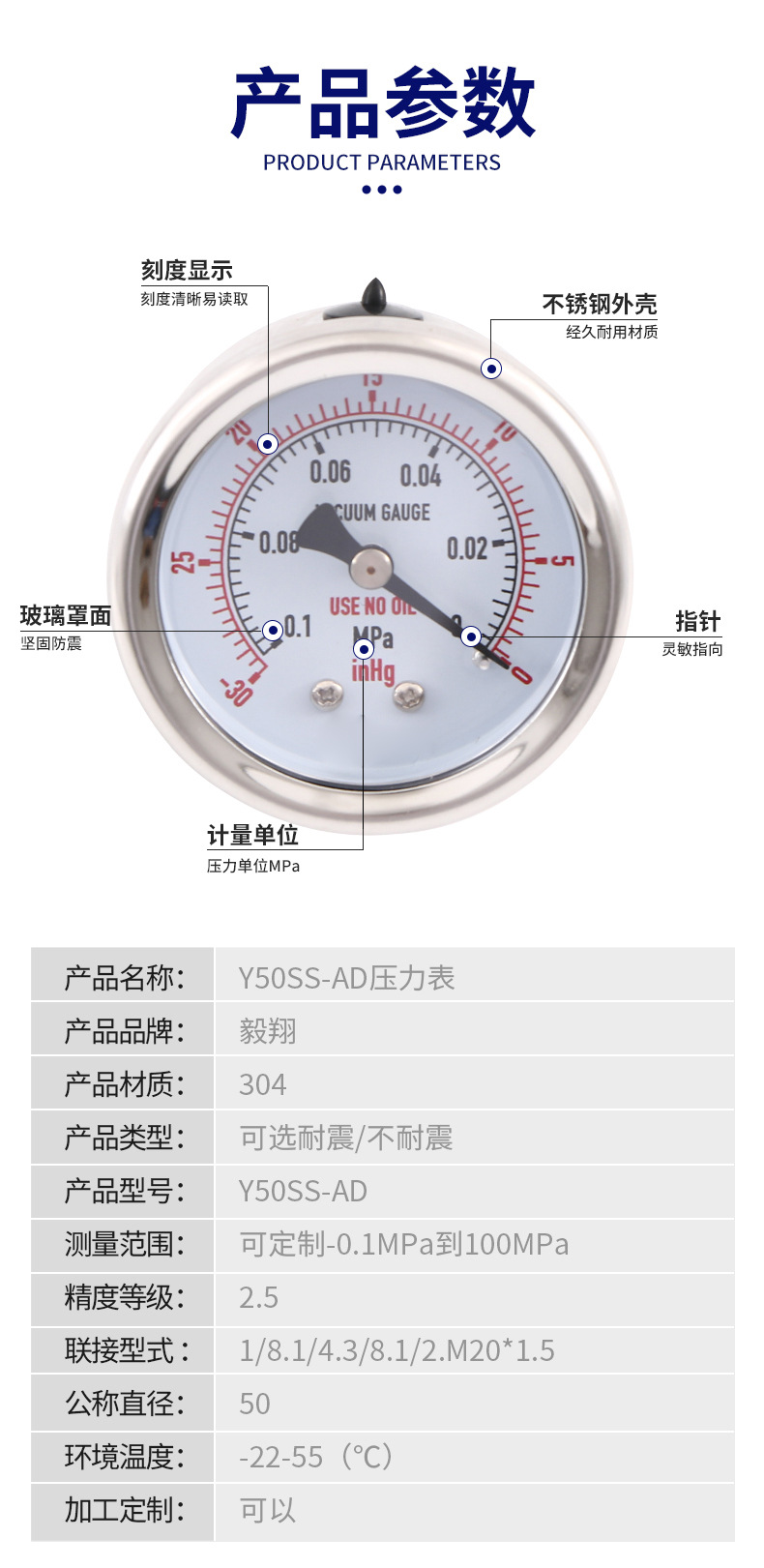 Y50SS-AD Pressure Gauge (0.1-100 MPa, 2.5 Accuracy, 50mm Diameter) for Water Air Gas Vacuum Systems