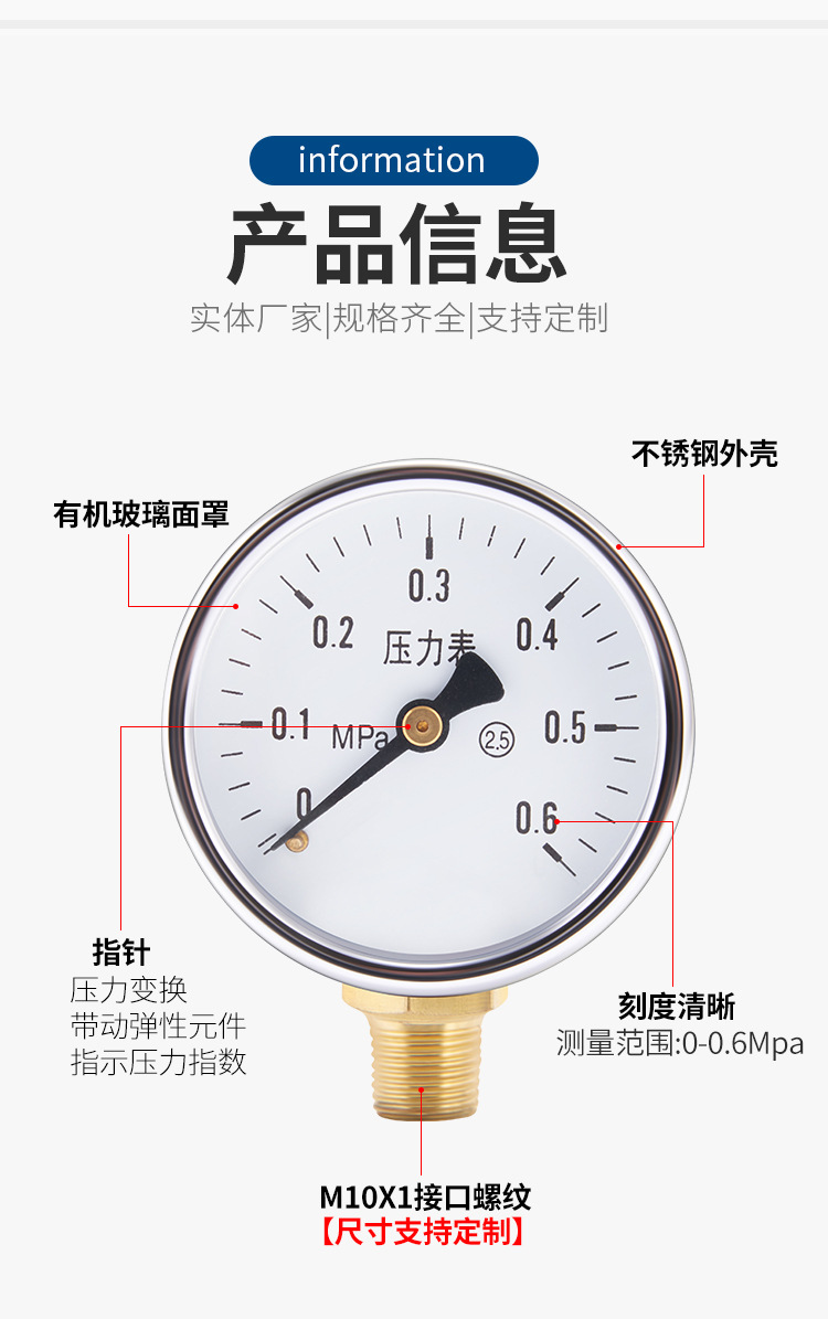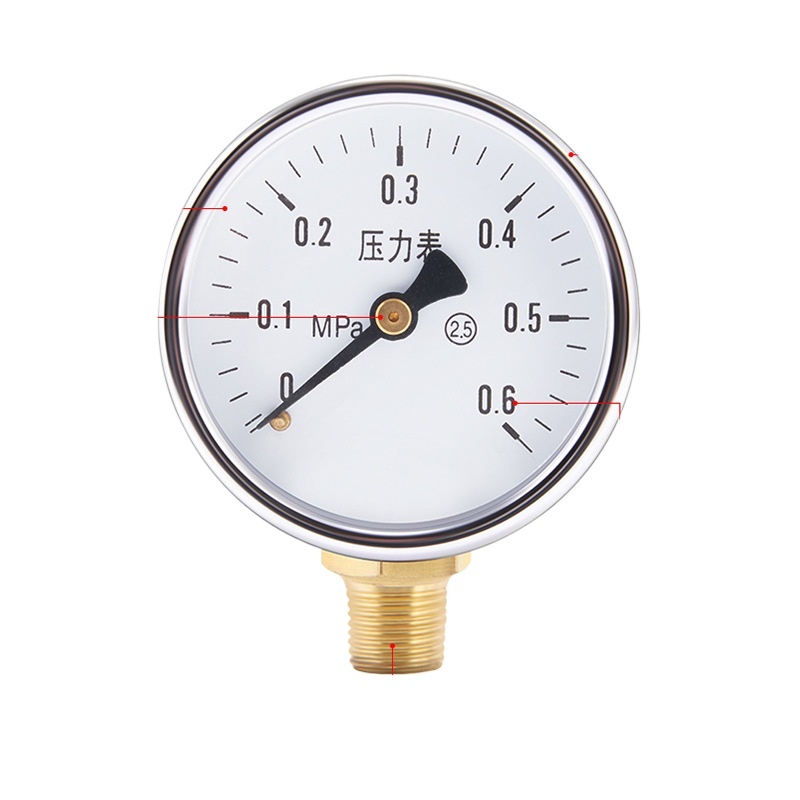 Y60 Stainless Steel Pressure Gauge (0-0.6MPa) for Hydraulic Water Air Pressure, Threaded Pointer Type