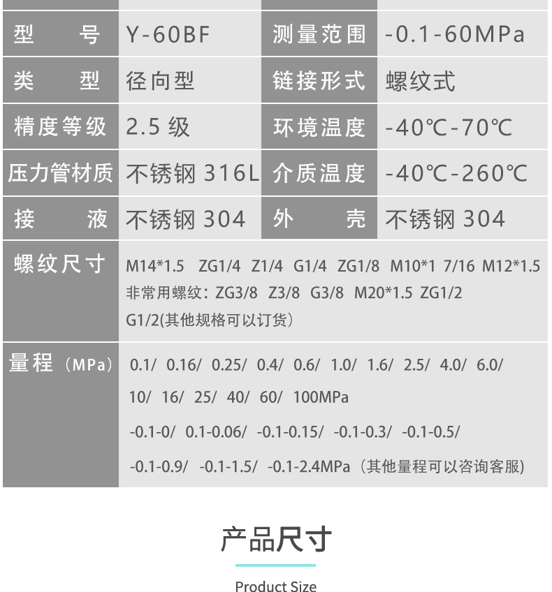 Y60BF Stainless Steel Pressure Gauge (0-1.6 MPa, 2.5 Accuracy) for Gas, Liquid, Oil, Water Pressure Systems