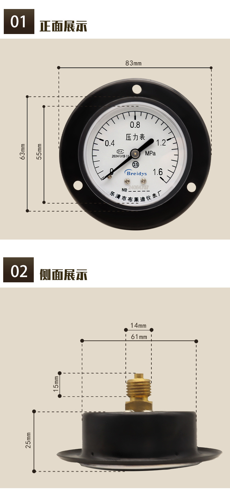 Y60ZT Axial Pressure Gauge 0-1.6MPa for HVAC Systems, Breidys HVAC Series, Replacing ZG1/4 Analog Gauges